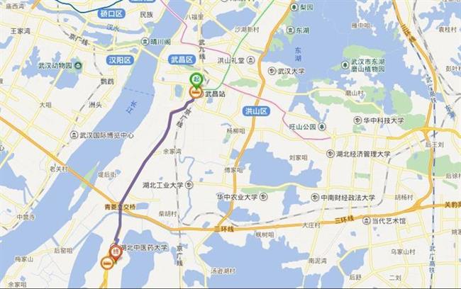 武昌火車站至武漢科技大學黃家湖校區(qū)路線圖如下所示: