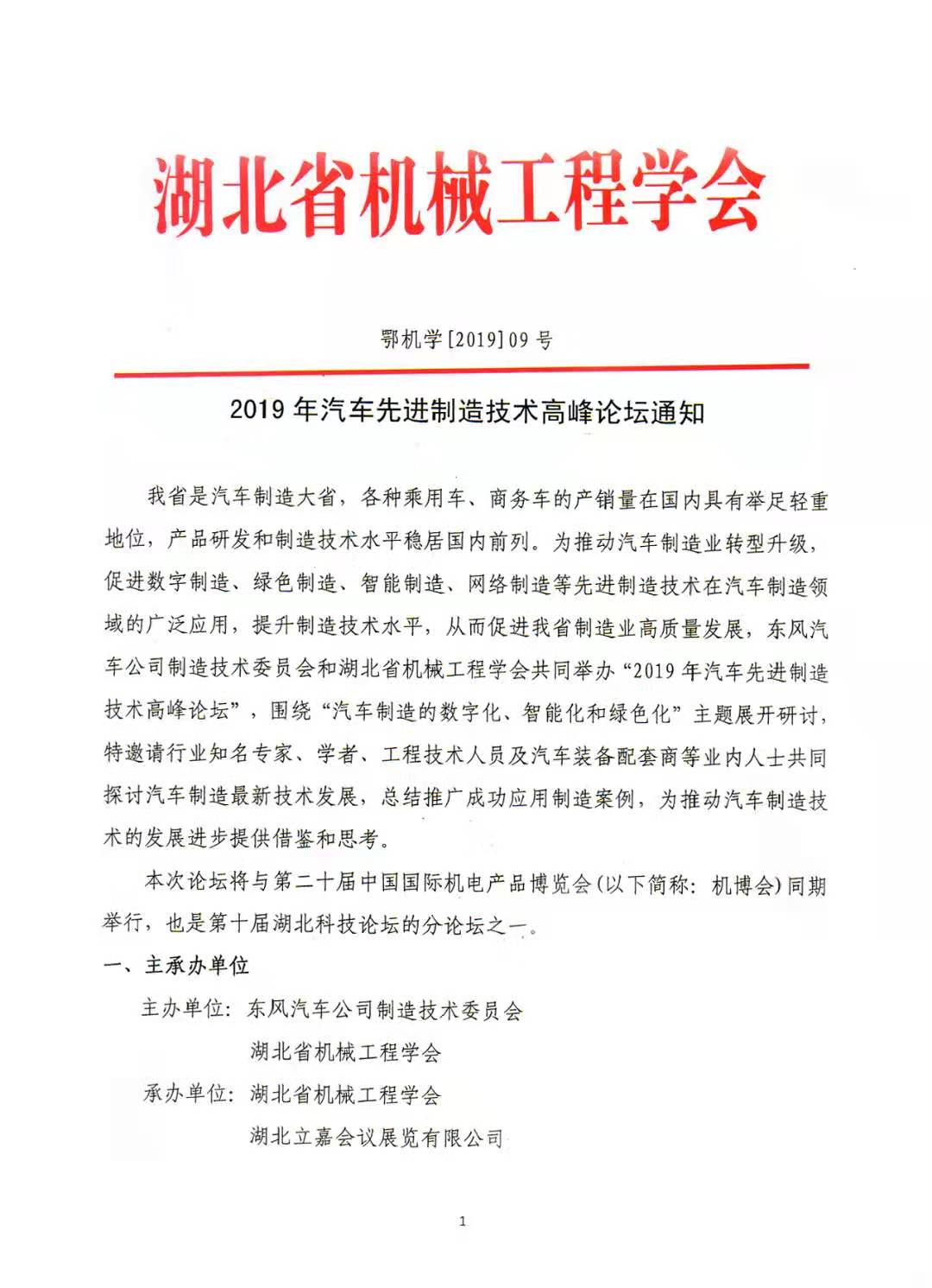 2019年汽車先進(jìn)制造技術(shù)高峰論壇通知