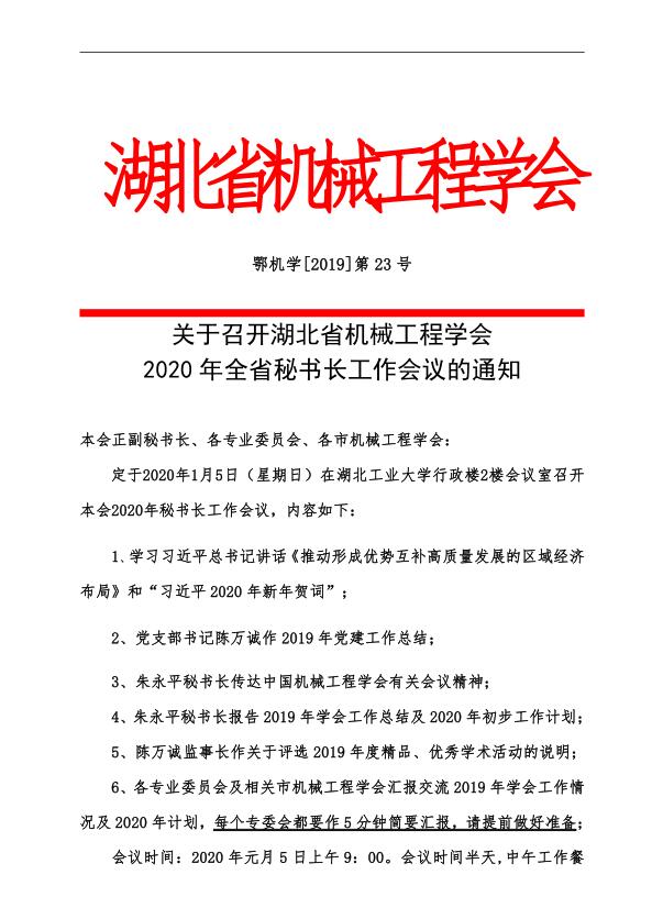 定于 2020 年1月5日(星期日)在湖北工業(yè)大學(xué)行政樓2 樓會議室召開本會 2020 年秘書長工作會議。