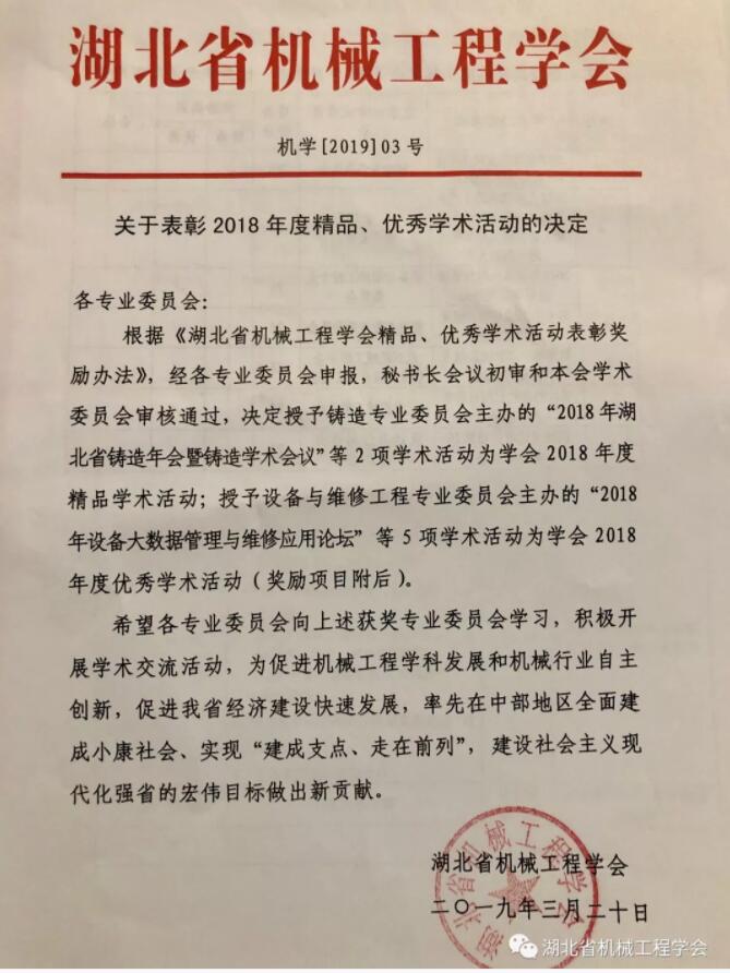 2019年3月23日上午,湖北省暨武漢機(jī)械工程學(xué)會2019年理事(擴(kuò)大)會議暨學(xué)術(shù)報(bào)告會在武漢科技大學(xué)黃家湖校區(qū)舉辦。會上表彰了學(xué)會2018年度7項(xiàng)精品、優(yōu)秀學(xué)術(shù)活動。表彰和鼓勵各專委會積極開展學(xué)術(shù)交流活動,為促進(jìn)機(jī)械工程學(xué)科發(fā)展和機(jī)械行業(yè)自主創(chuàng)新,實(shí)現(xiàn)“建成支點(diǎn)、走在前列”,建設(shè)社會主義現(xiàn)代化強(qiáng)省的目標(biāo)做出新的貢獻(xiàn)。