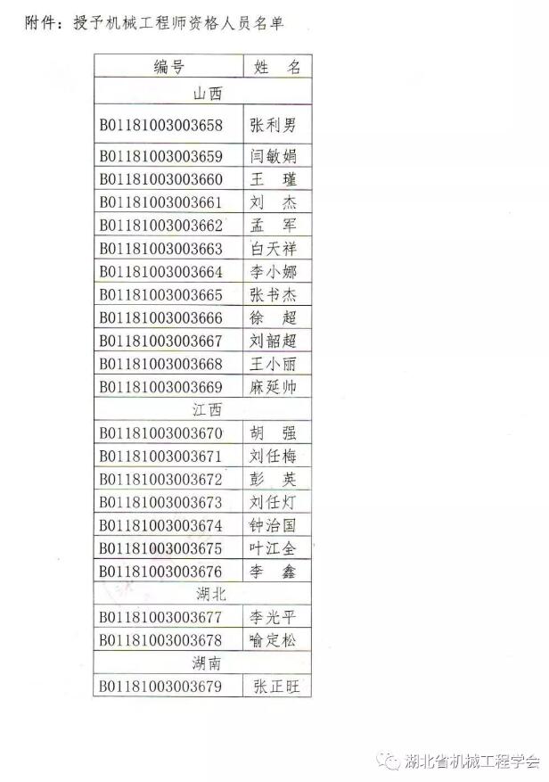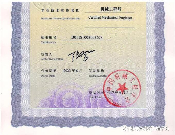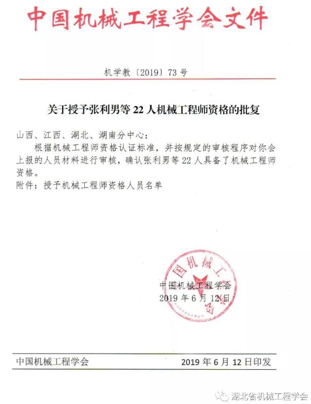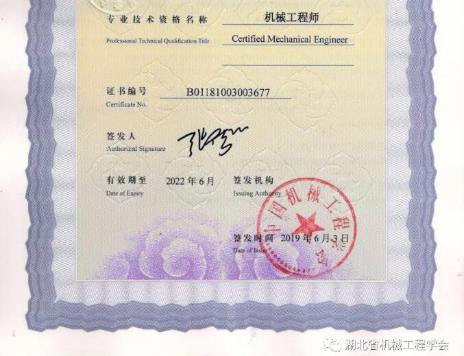 通過(guò)機(jī)械工程師資格考試,成績(jī)合格,經(jīng)湖北省機(jī)械工程學(xué)會(huì)初審申報(bào),中國(guó)機(jī)械工程學(xué)會(huì)批準(zhǔn),湖北省機(jī)械工程學(xué)會(huì)李光平、喻定松獲得中國(guó)機(jī)械工程學(xué)會(huì)(CMES)授予的機(jī)械工程師資格證書(shū)。