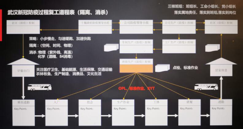 東風(fēng)商用車陳偉老師具體介紹了東風(fēng)商用車的經(jīng)驗(yàn),從員工上班入廠、下班回家、物料入廠、產(chǎn)品下線出廠等方面結(jié)合各個(gè)車間的生產(chǎn)工藝制定以班組級(jí)、車間級(jí)、公司級(jí)三級(jí)防疫控制機(jī)制。同時(shí)作成可落地可執(zhí)行新冠防疫過(guò)程復(fù)工道程表,為參會(huì)企業(yè)提供參考,具體見(jiàn)下圖:
