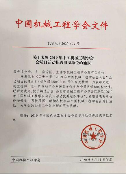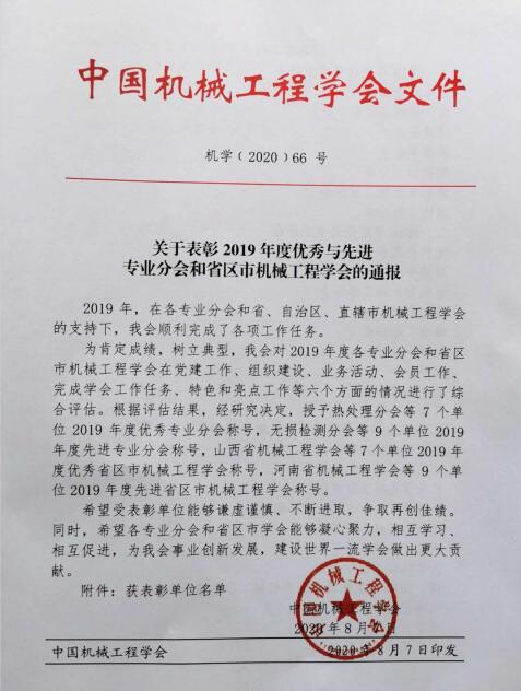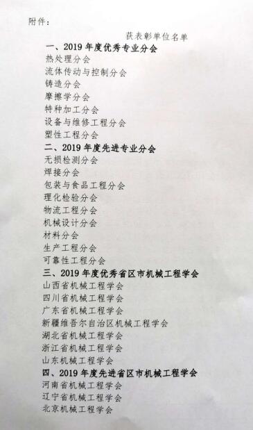 中國(guó)機(jī)械工程學(xué)會(huì)(CMES)召開(kāi)表彰大會(huì),表彰2019年度優(yōu)秀與先進(jìn)專業(yè)分會(huì)和省區(qū)市機(jī)械工程學(xué)會(huì)。