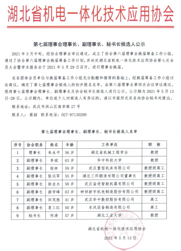 湖北省機(jī)電一體化技術(shù)應(yīng)用協(xié)會第七屆理事會理事長、副理事長、秘書長候選人公示