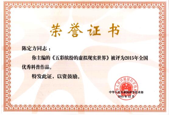 2015年4月中國(guó)水利水電出版社出版發(fā)行科普著作《五彩繽紛的虛擬現(xiàn)實(shí)世界》(書號(hào)ISBN:9787517027737),是由機(jī)械設(shè)計(jì)與傳動(dòng)專委會(huì)榮譽(yù)理事長(zhǎng)陳定方教授主編。該書獲得科技部2015年全國(guó)優(yōu)秀科普作品獎(jiǎng)、2016年中國(guó)科普作家協(xié)會(huì)優(yōu)秀作品獎(jiǎng)銀獎(jiǎng)。