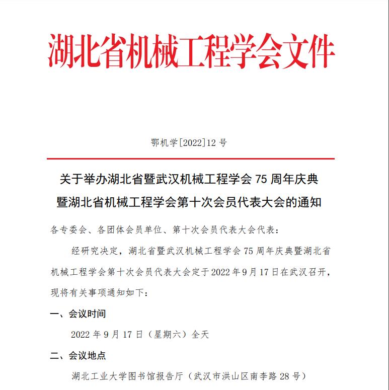 湖北省暨武漢機械工程學(xué)會75周年慶典暨第十次會員代表大會通知