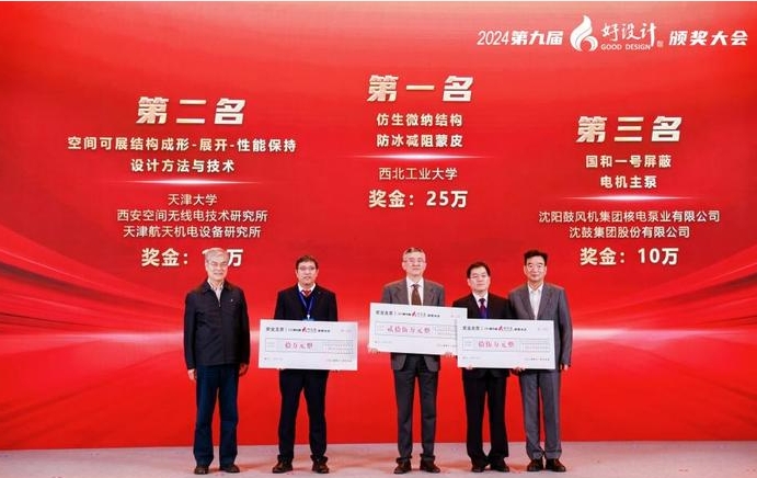 潘云鶴院士與浙江雙環(huán)傳動(dòng)機(jī)械股份有限公司董事長吳長鴻先生共同為2024“好設(shè)計(jì)”獎(jiǎng)前三名的項(xiàng)目頒發(fā)獎(jiǎng)金。仿生微納結(jié)構(gòu)防冰減阻蒙皮、空間可展結(jié)構(gòu)成形-展開-性能保持設(shè)計(jì)方法與技術(shù)、國和一號(hào)屏蔽電機(jī)主泵三個(gè)項(xiàng)目分別獲得25萬、15萬和10萬元獎(jiǎng)金。