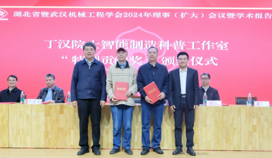 陳學東院士宣讀“丁漢院士智能制造科普工作室特別貢獻獎”頒獎詞,丁漢院士、李定君為獲獎代表武漢理工大學教授陳定方、武漢大學教授潘春旭頒獎。