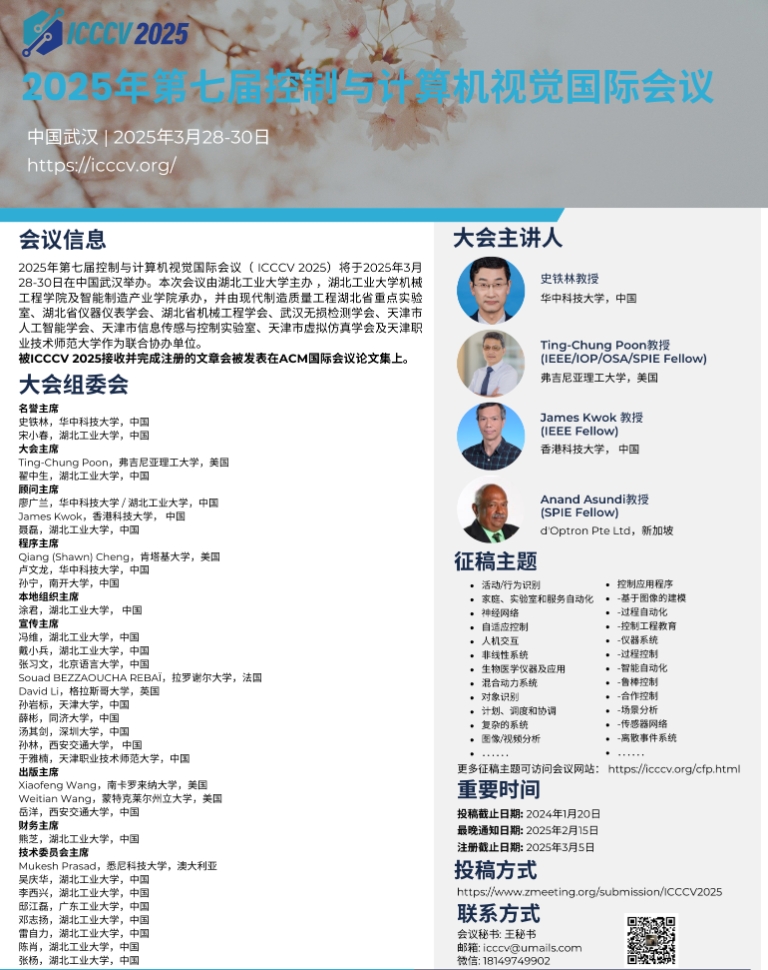 2025年第七屆控制與計(jì)算機(jī)視覺(jué)國(guó)際會(huì)議將于2025年3月28日至30日在湖北工業(yè)大學(xué)召開。