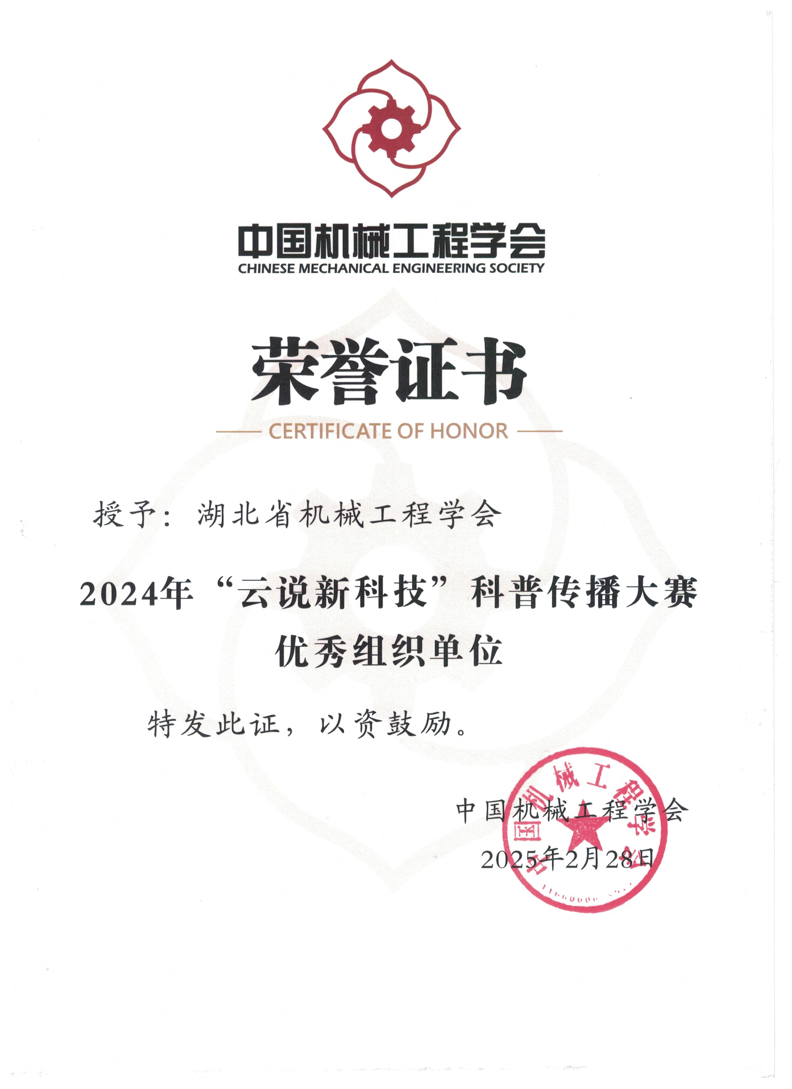 湖北省機械工程學會獲得2024年度優(yōu)秀省區(qū)市學會和“云說新科技” 科普傳播大賽優(yōu)秀組織單位獎。