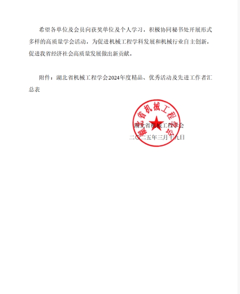 湖北省機械工程學(xué)會關(guān)于表彰2024年度學(xué)會精品、優(yōu)秀活動及先進(jìn)工作者的決定。